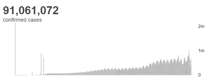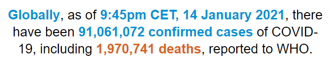 根据世卫组织最新实时统计数据,截至欧洲中部时间1月14日21时45分(北京时间1月15日4时45分),全球累计新冠肺炎确诊病例91061072例,累计死亡病例1970741例。