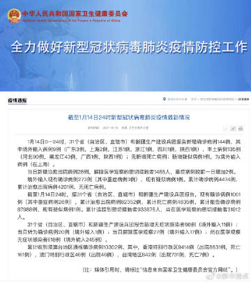 截至1月14日24时,据31个省(自治区、直辖市)和新疆生产建设兵团报告,现有确诊病例1001例(其中重症病例26例),累计治愈出院病例82352例,累计死亡病例4635例,累计报告确诊病例87988例,现有疑似病例1例。累计追踪到密切接触者933875人,尚在医学观察的密切接触者31912人。