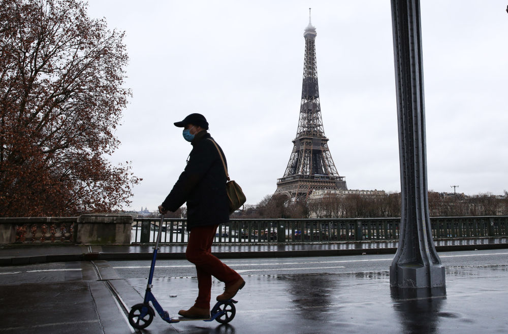 1月13日,一男子骑滑板车经过法国巴黎埃菲尔铁塔附近的比尔哈克姆桥。(新华社记者高静摄)