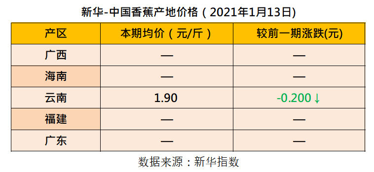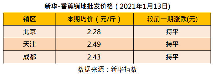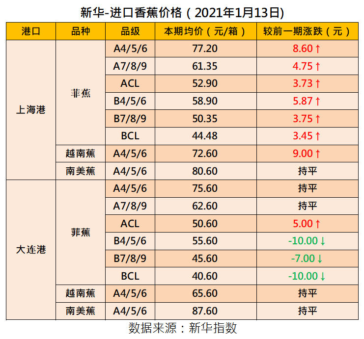 本监测期内(1月7日—1月13日),香蕉产地价格呈现先涨后跌走势,在本监测期前半段,云南、广西产区好货抢手,行情稳中向好,后半段香蕉价格微幅下跌,目前整体行情趋稳;销地批发市场方面,当前香蕉走货总体较为平稳,蕉价窄幅震荡;进口蕉方面,蕉价逐渐回归理性,上海港蕉价普涨,大连港受疫情影响走货不畅价格有下跌趋势;皇帝蕉方面,澄迈县福山镇等区域出货量较前期有所增加,但由于前期蕉价突然大涨订货商大多较为谨慎,产区走货不快,蕉农急于出货开始降价出售,价格降幅达50%以上,昌江、乐东、陵水、东方等县域受前期寒潮影响产区供货期尚未恢复正常,供应趋紧,蕉价仍处于高位。