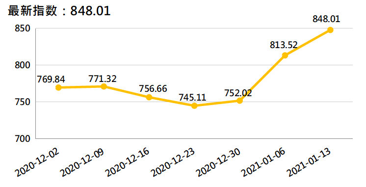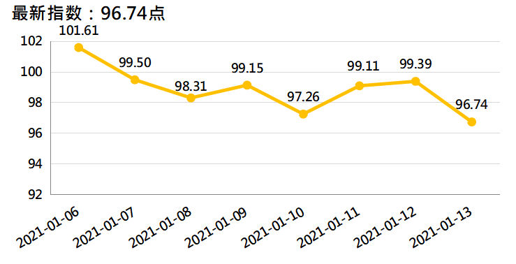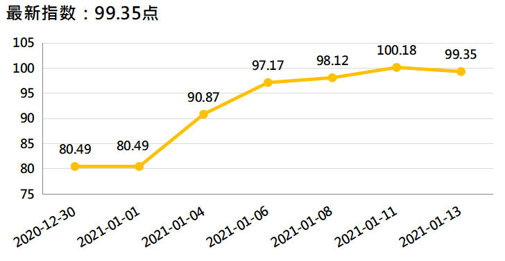 新华财经北京1月15日电(李水艳、李伯罧、薛志烜)新华-中国香蕉产业四大指数显示,截至2021年1月13日,国内香蕉产地价格指数报99.35点,较上一发布日(2021年1月6日,下同)97.17点上涨2.24%;香蕉销地批发价格指数报96.74点,较上一发布日101.61点下跌4.79%;进口蕉价格指数报848.01点,较上一发布日813.52点上涨4.24%;皇帝蕉产地价格指数报1176.20点,较上一发布日1700.24点下跌30.82%。