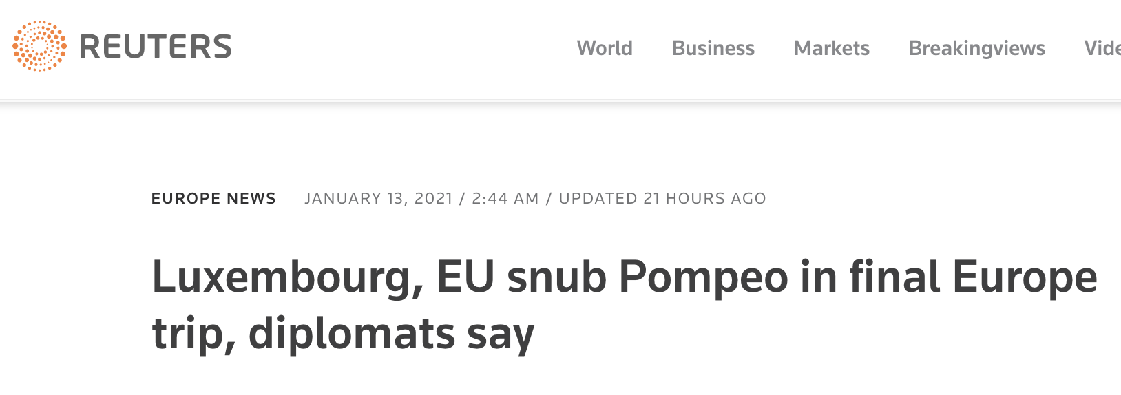 近日,美国国务卿蓬佩奥原定于1月13日开始的欧洲之行被取消,美国国务院解释称是因为交接工作。但路透社爆料称,蓬佩奥取消行程是因为欧洲官员不愿意见他。