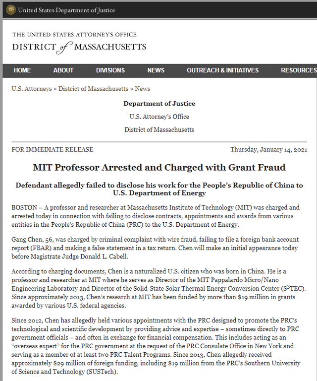 根据指控文件,陈刚是美籍华人(毕业于华中科技大学),担任MIT帕帕拉多微纳米工程实验室主任和固态太阳能热能转换中心主任。大约从2013年开始,他在MIT的研究已经获得了美国联邦机构授予的1900多万美元的资助。
