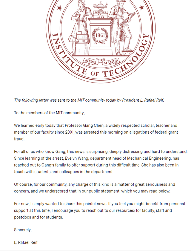MIT校长L. Rafael Reif给学校师生员工发送邮件,对此表示震惊,并称陈刚是一位广受尊敬的学者和教员,他的被捕是令人惊讶、深感痛苦和难以理解的。