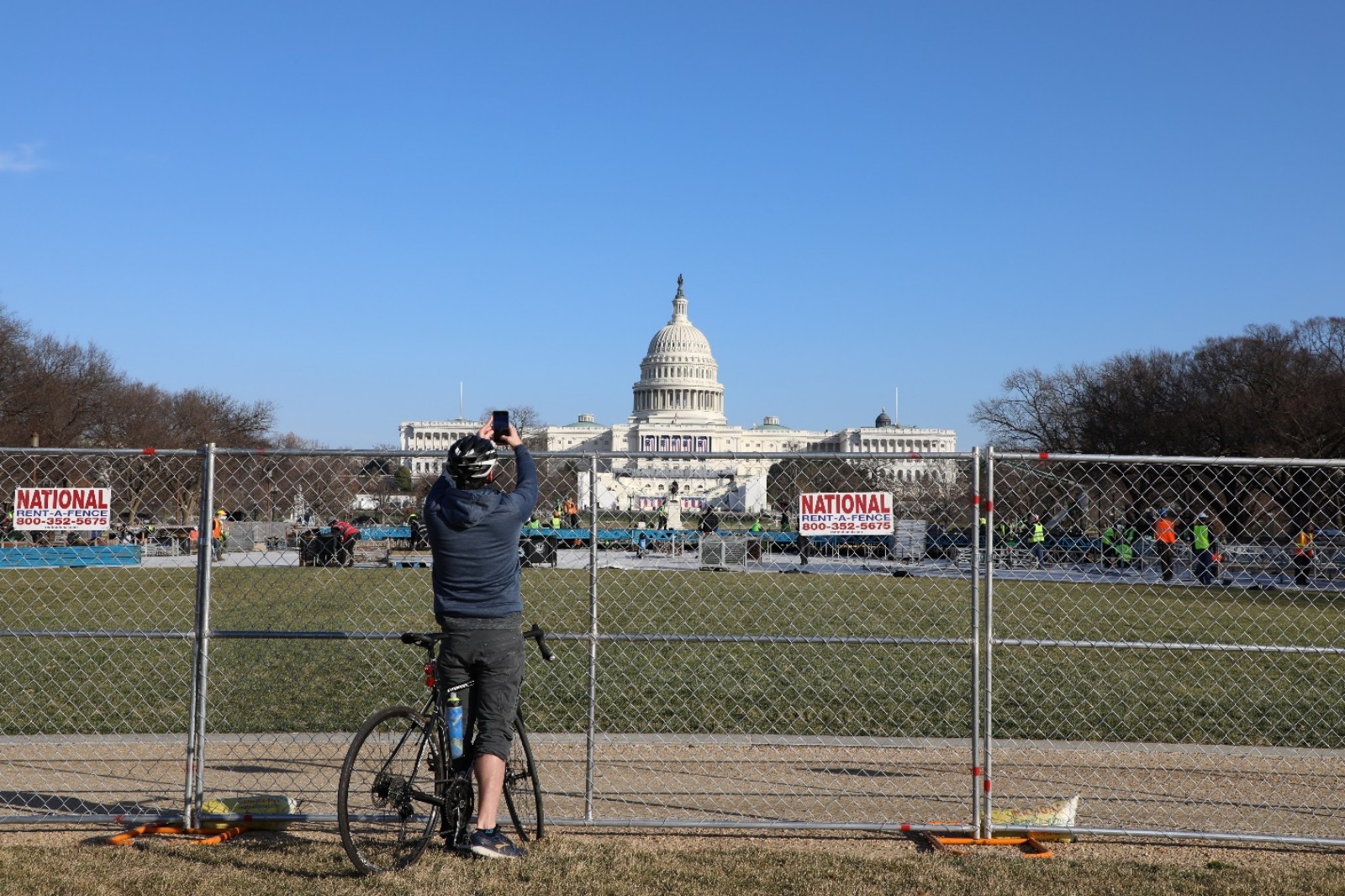 随着美国总统就职典礼的临近,美国首都华盛顿加强了安全警备,国会大厦周围很远处就竖起了围栏。图为1月14日下午,一名男子隔着围栏拍摄美国国会大厦。(人民日报记者张梦旭 摄)