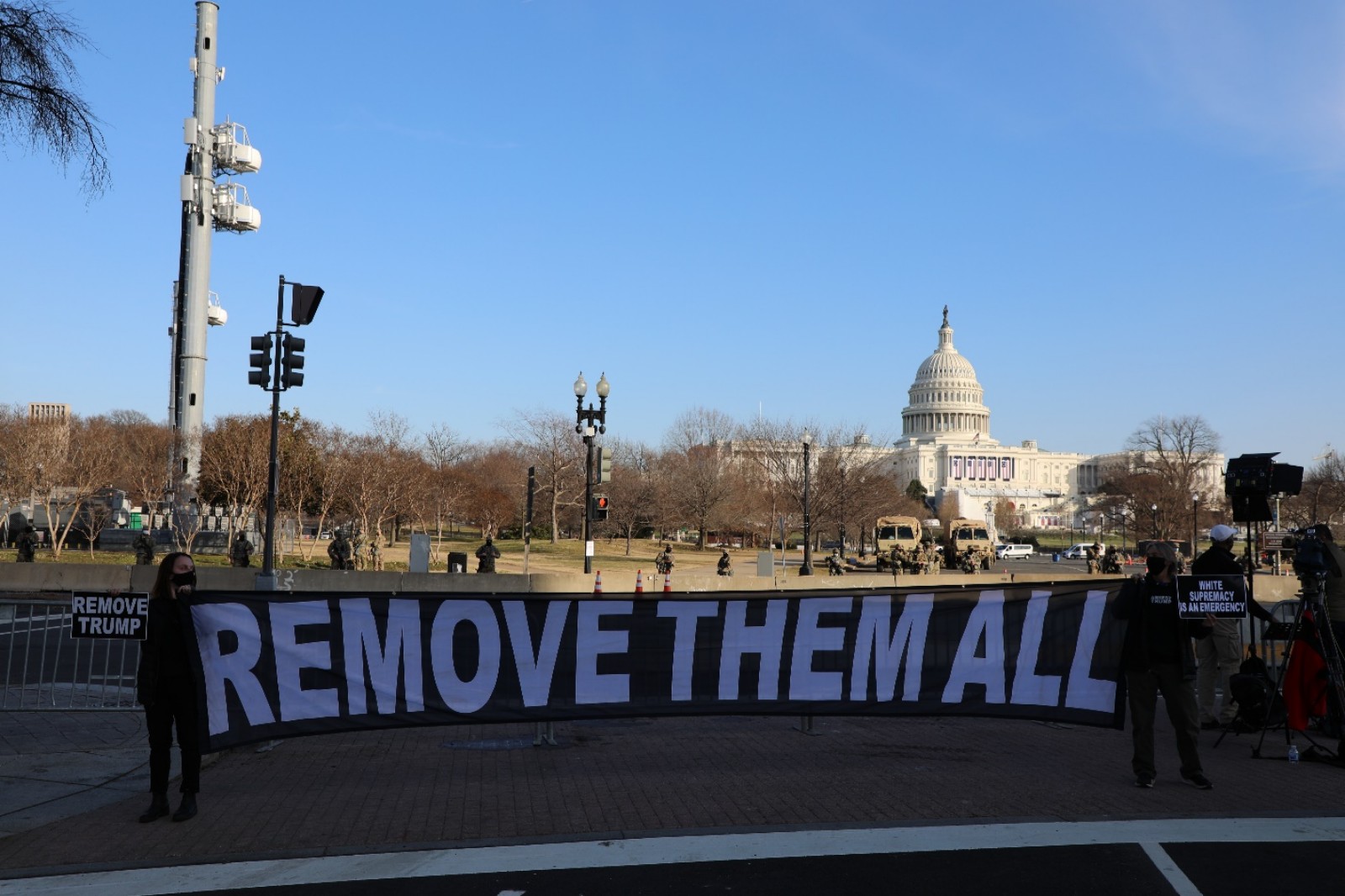 1月14日下午,美国国会大厦附近,抗议群众要求拆除这些路障和围栏。