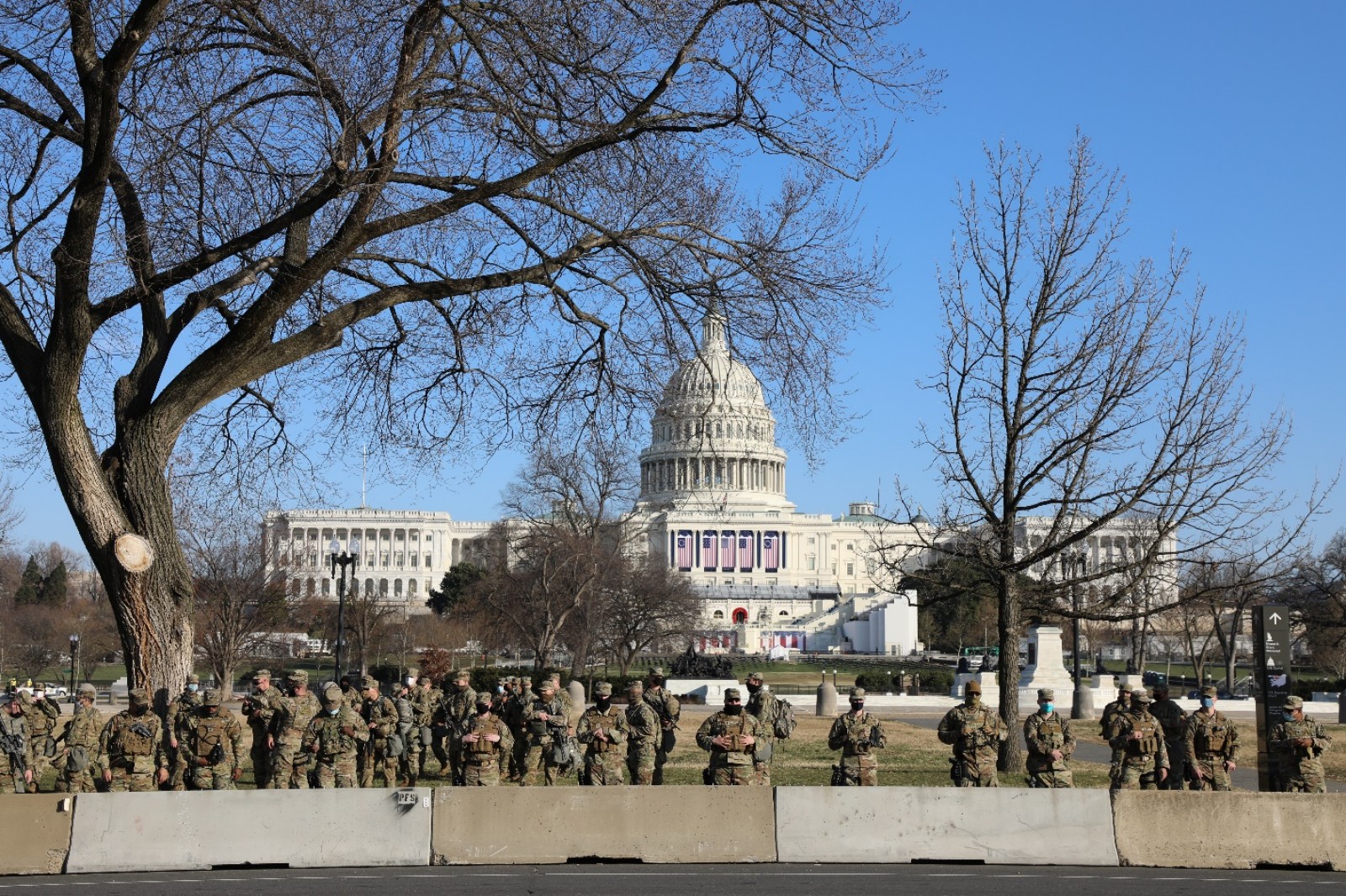 隔着围栏拍摄正在国会大厦外站岗的国民警卫队员。