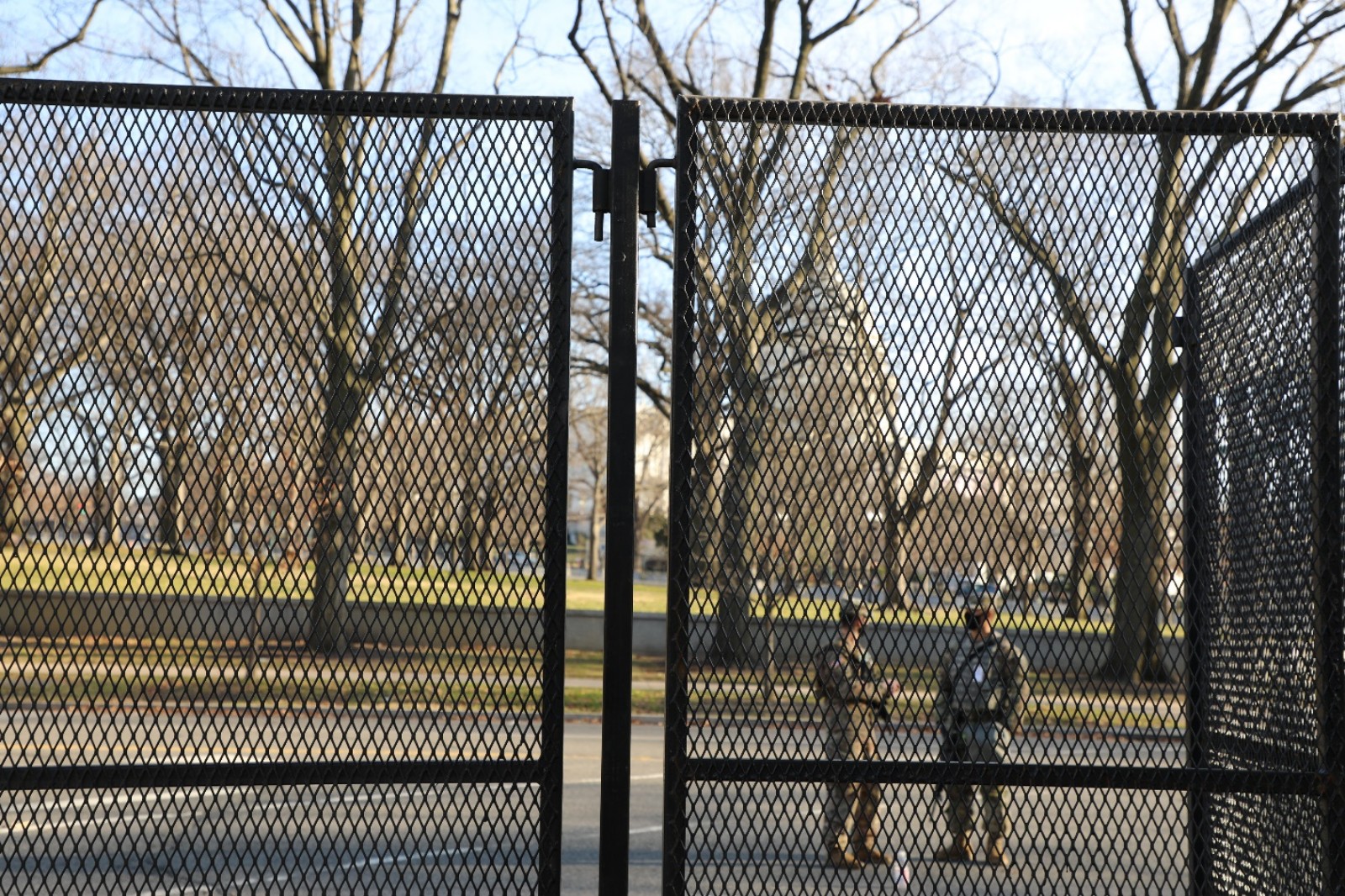 隔着围栏拍摄正在国会大厦附近站岗的国民警卫队员。