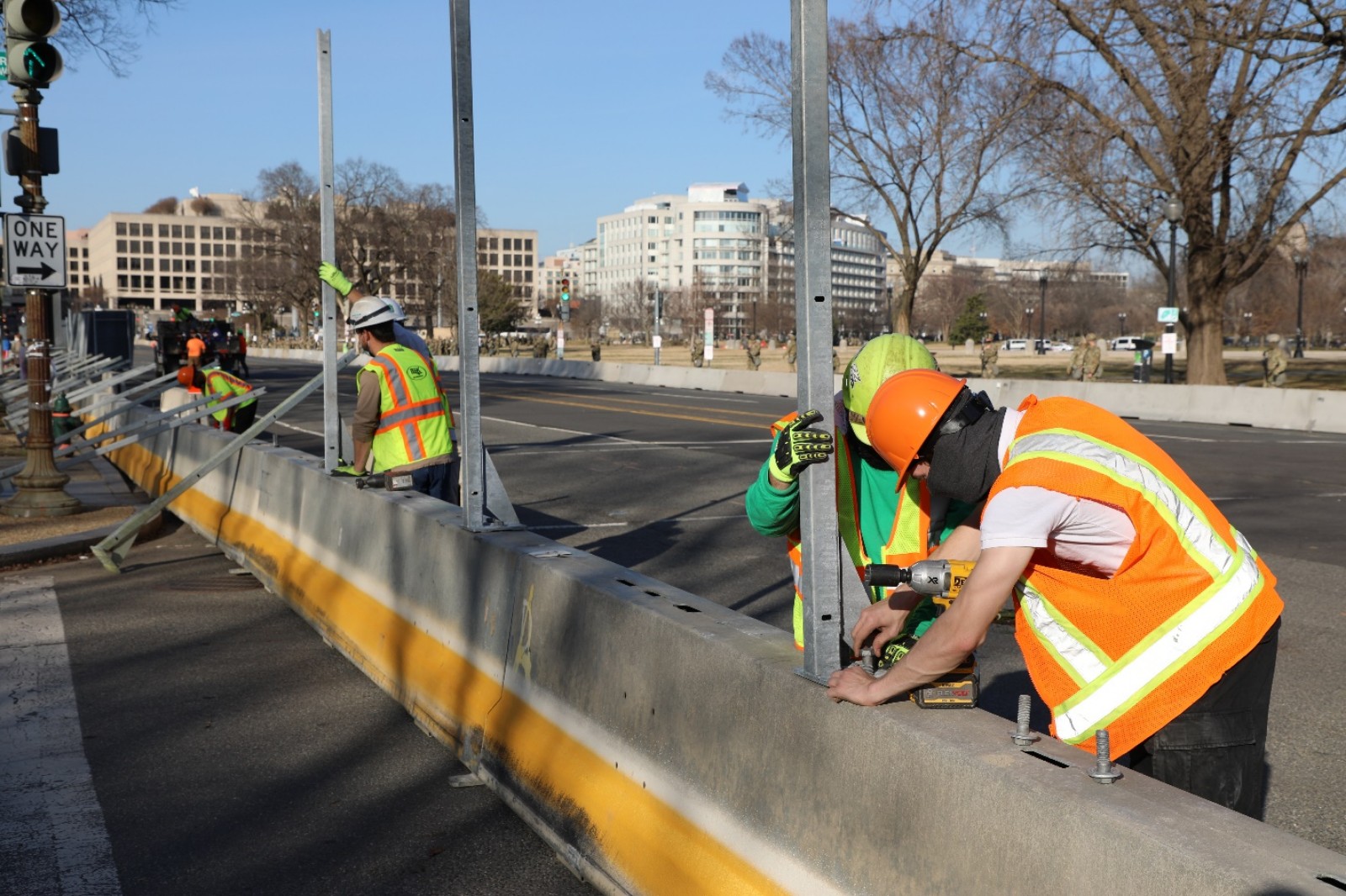 1月14日下午,美国国会大厦附近,工人正在安装防护栏。