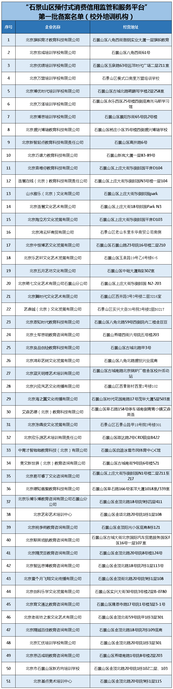 1月14日,北京市石景山区教委向社会公开发布首批“预付式消费信用监管和服务平台校外培训机构注册名单”,共计51家校外培训机构。为进一步规范预付式消费市场,石景山区在全市范围内率先推出“石景山区预付式消费信用监管和服务平台”,并有序开展全区各类经营商户预付式消费业务的上线工作。在石景山区区委政法委、区教委、区市场监管局、属地街道等各相关部门的引导下, 首批51家校外培训机构纳入“石景山区预付式消费信用监管和服务平台”接受监管。