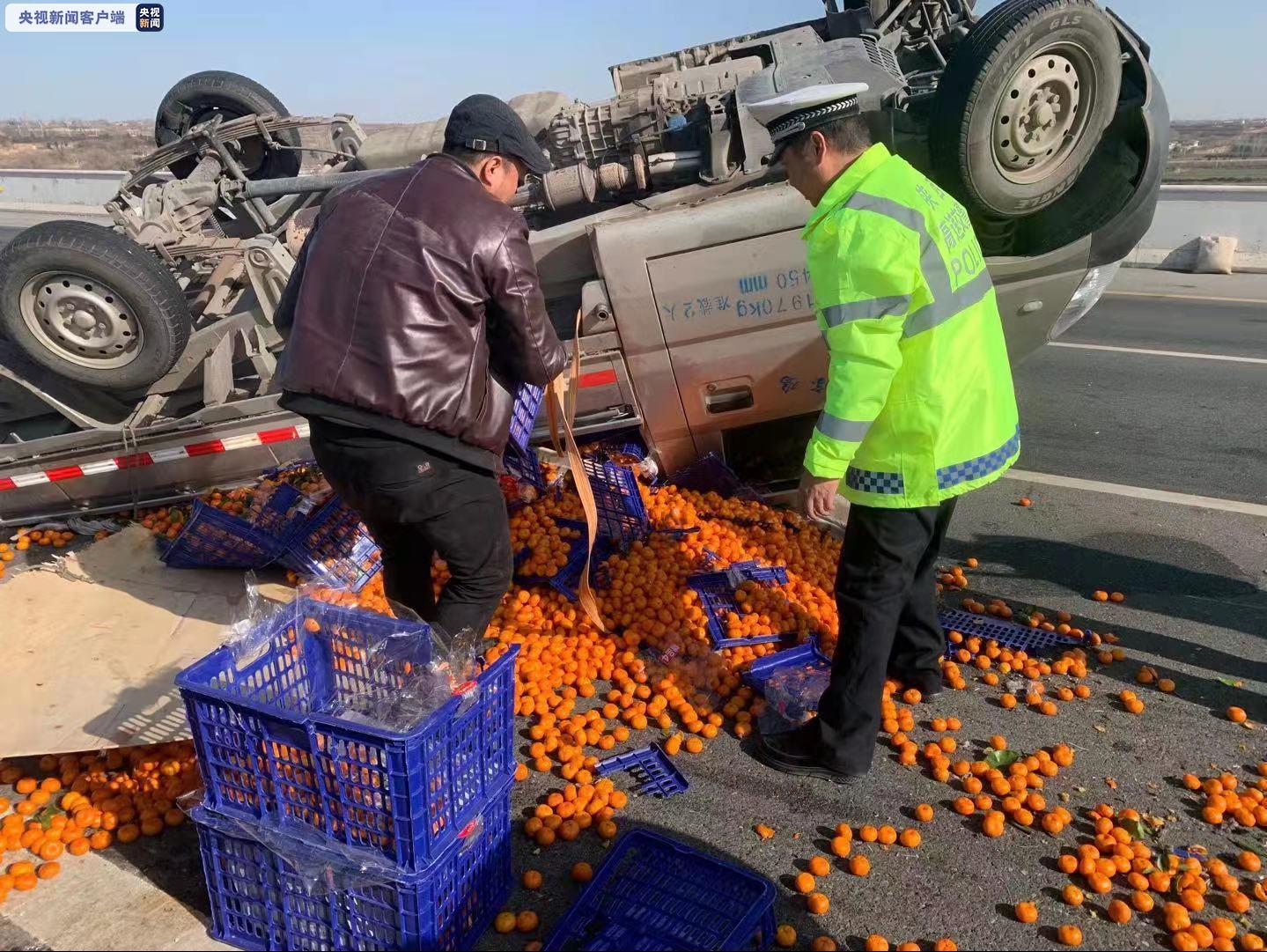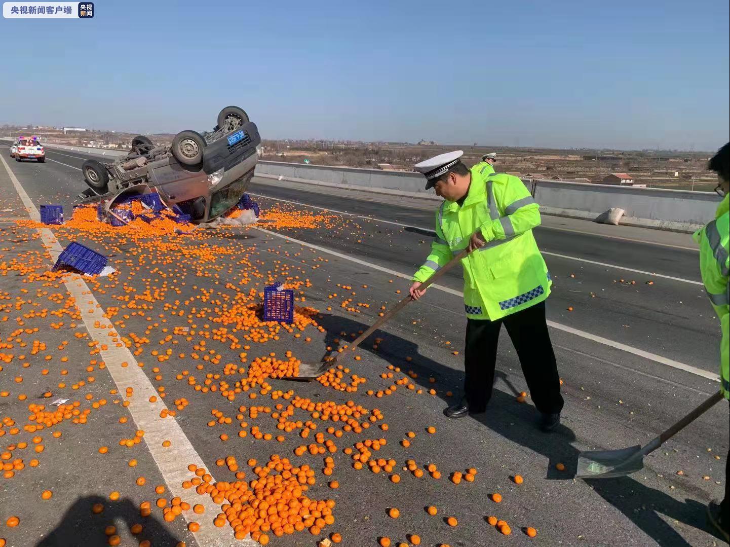 2021年1月14日14时许,陕西省宝鸡市高交大队民警在巡逻中发现,在银昆高速K570+200m处一辆轻型货车侧翻,将拉的满车贡橘散落一地,占用2个车道,民警及时封锁事故现场,引导其他车辆有序通行,并及时安排车辆帮助救援。