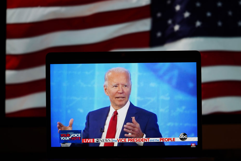2020年10月15日拍摄的照片显示,电视上正在播放民主党总统候选人、前美国副总统拜登在宾夕法尼亚州费城参加选民问答会的节目。(新华社记者刘杰摄)