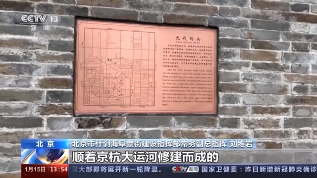 北京市什刹海阜景街建设指挥部常务副总指挥 刘维岩:这一带就是我们新恢复的叫元代码头,它是元大都建成伊始的时候顺着京杭大运河修建而成的一条人为规划的斜街,后来的随着人物的变迁,水退人尽的历史沧桑形成了这么一个高台阶,我们在这一次鼓西大街更新保护当中我们采取的老砖,老条石修旧如旧的原则给老百姓形成了一个人行的空间。