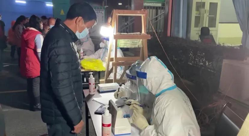 1月14日夜,南宁市江南区沃沃酒店门口,市民排队登记做核酸检测。图片来源:南宁新闻综合频道。