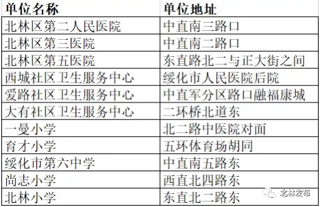 根据当前疫情防控需要,绥化市北林区正在全面开展新冠病毒核酸全员采样检测工作,此项工作将于1月16日晚完成。为确保核酸检测全覆盖,现将城内11个核酸采样点地址予以公布。原定以村、屯、社区、城内居住小区为单位设置临时采样点的方式不变,请广大城乡居民按照就近就便原则到采样点采样,避免人员聚集,提高采样效率,做到应检尽检、不漏一户、不落一人。