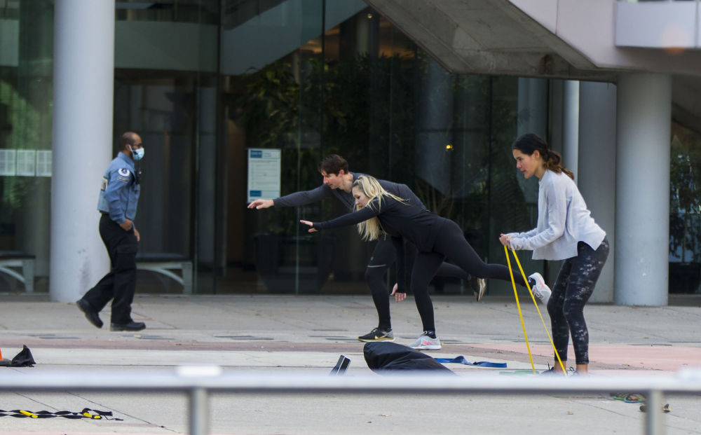 2020年11月14日,在加拿大多伦多一处空地,三人在户外做拉伸运动。(新华社记者邹峥摄)