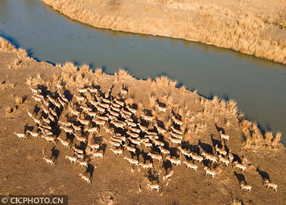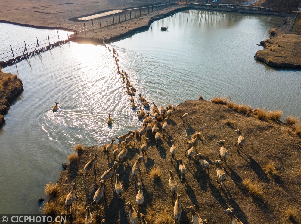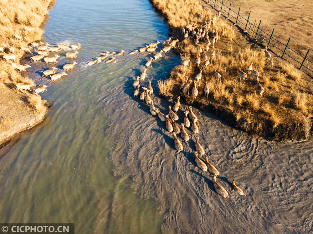 ↑2021年1月14日,在江苏省泰州市溱湖国家湿地公园,一群麋鹿在踏水过河。(无人机照片)CICPHOTO/顾继红 摄