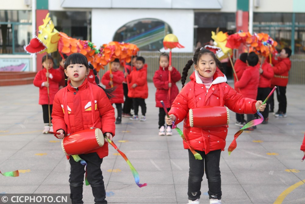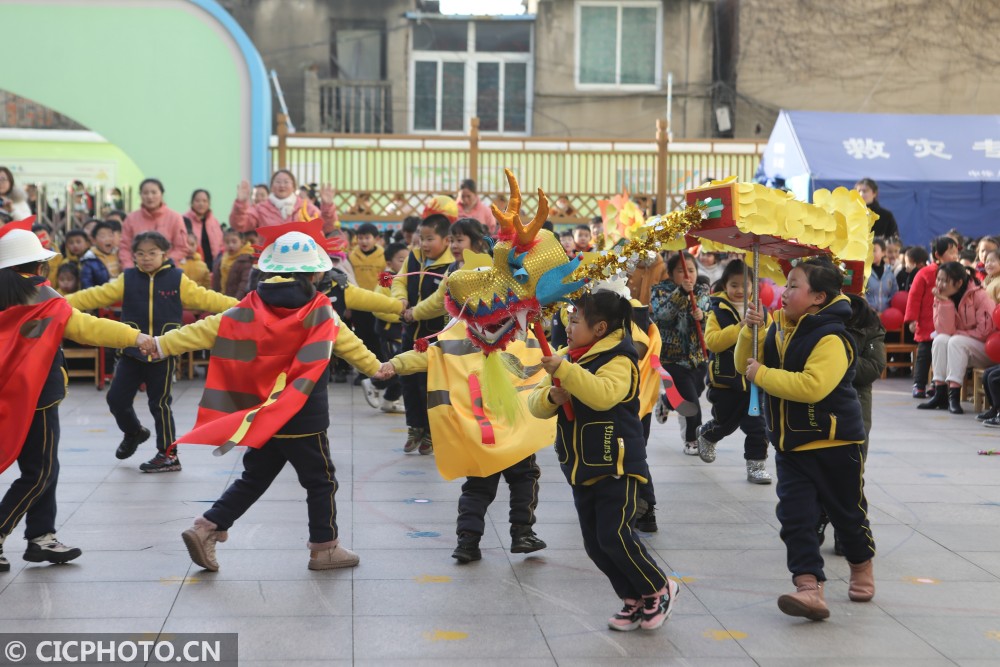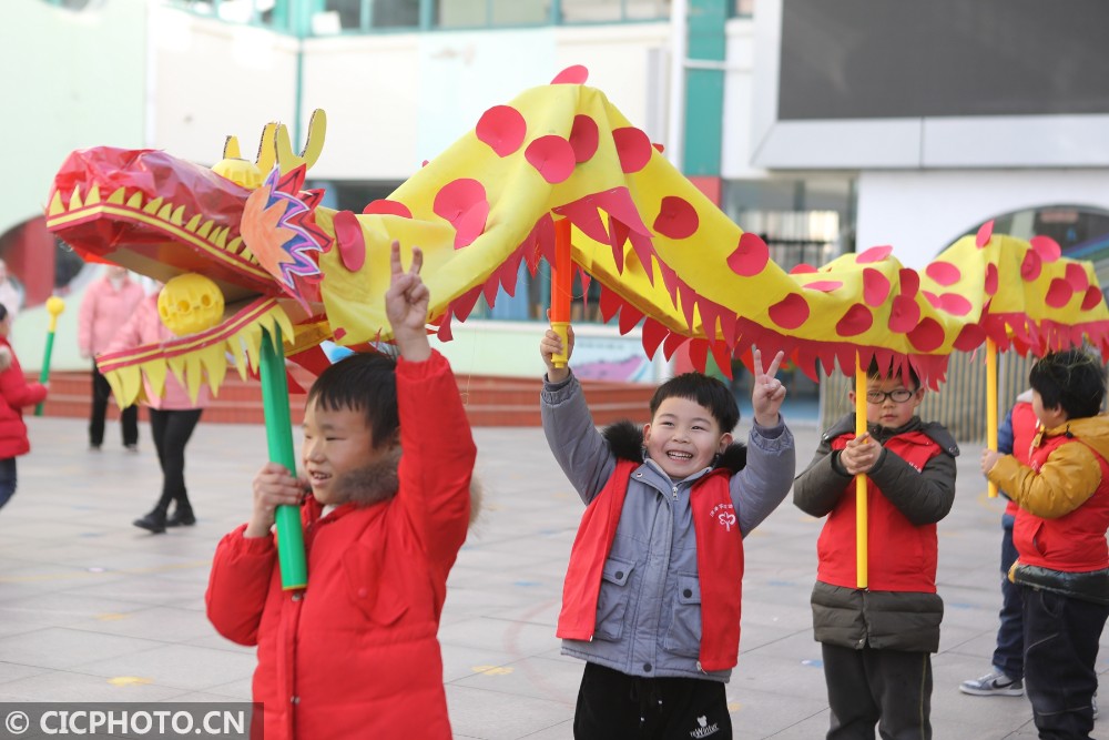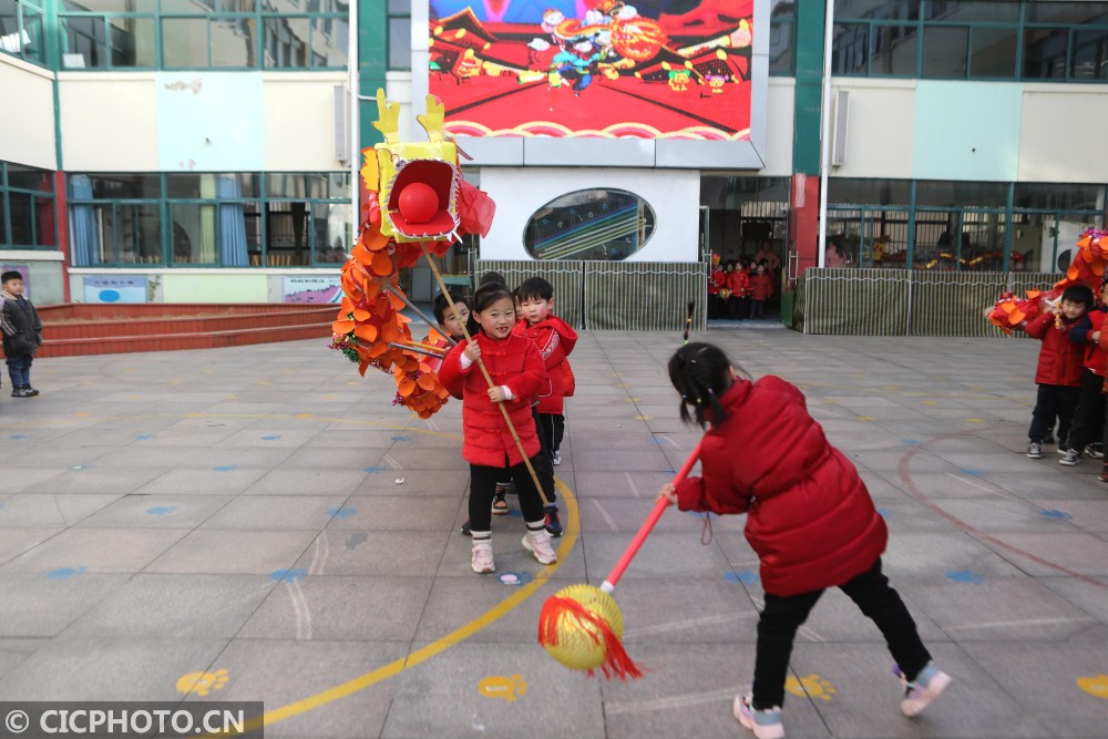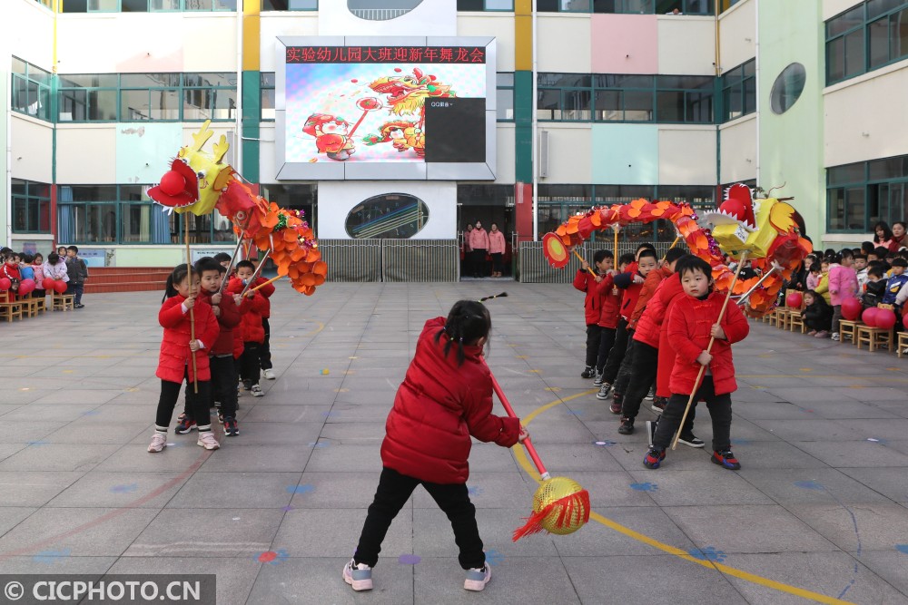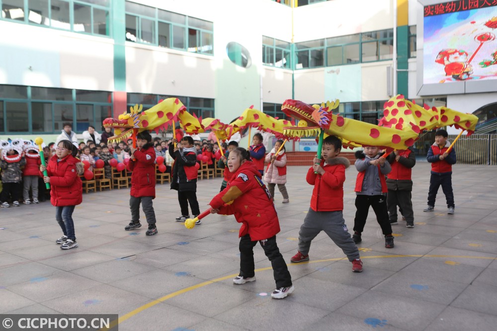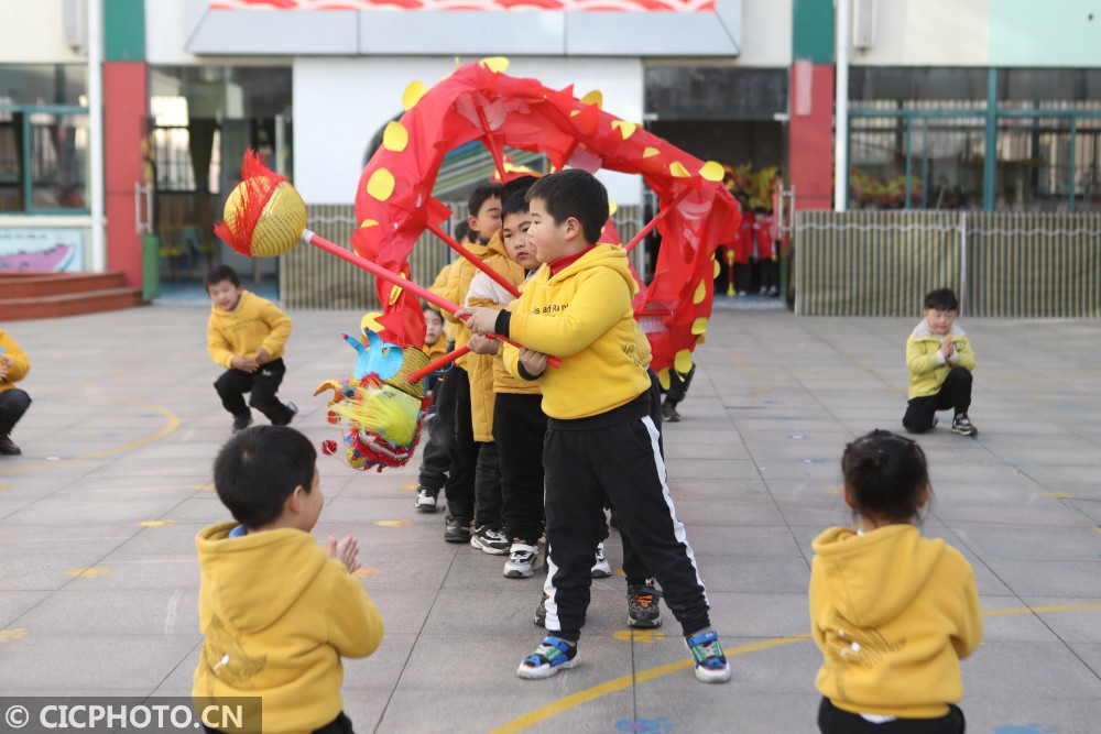 以上图片:江苏省淮安市洪泽实验幼儿园小朋友在幼儿园舞龙会上舞龙。CICPHOTO/万震 摄