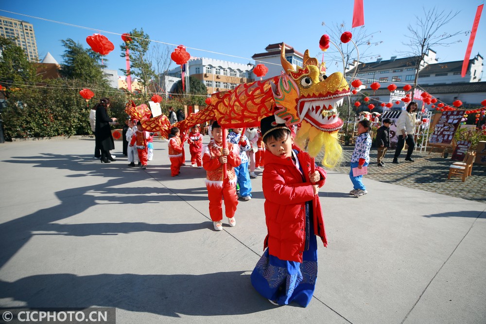 ↑浙江省东阳市实验幼儿园内,小朋友们在迎龙灯。CICPHOTO/胡扬辉 摄