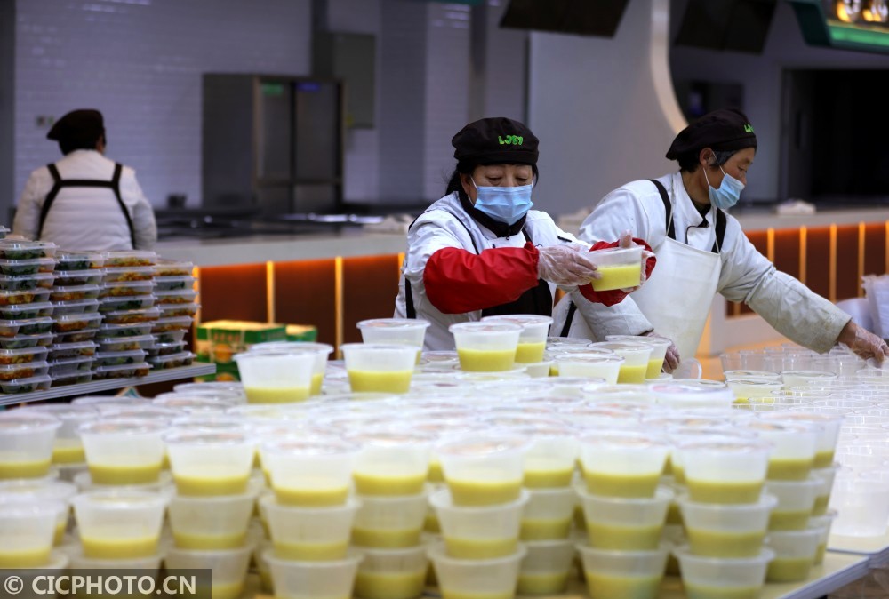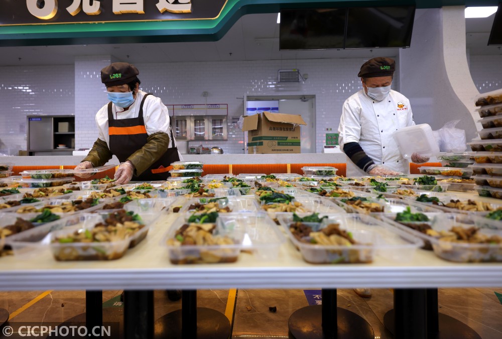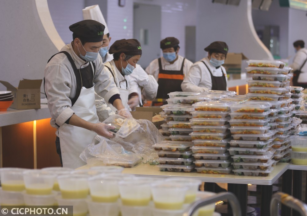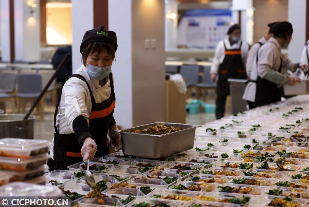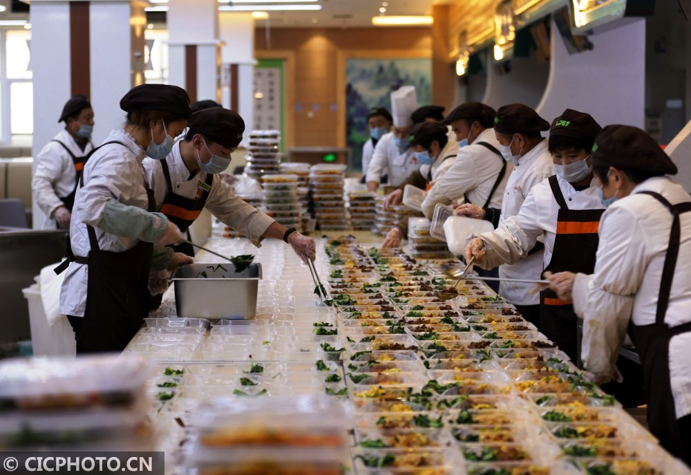 以上图片:2021年1月14日,在河北省邢台市广宗县第一中学集中隔离点,食堂员工在搭配营养午餐。CICPHOTO/王垒 摄