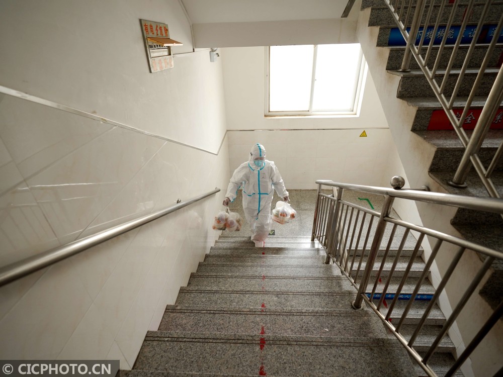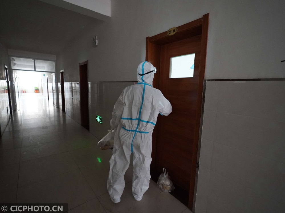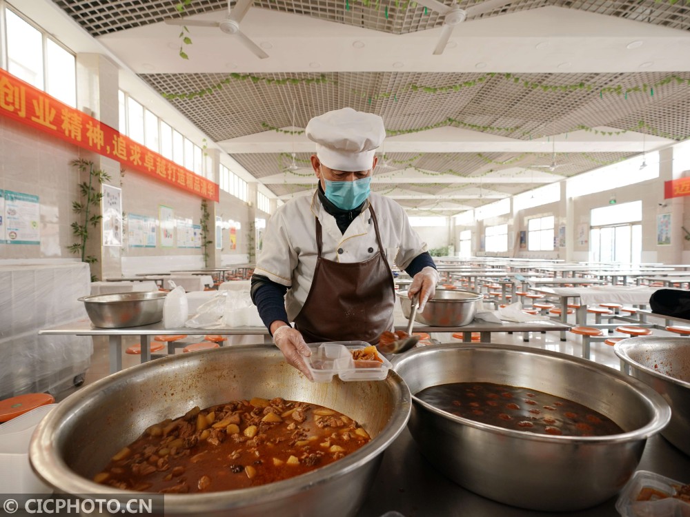 ↑2021年1月15日,在河北省邢台市巨鹿县清华园小学集中隔离点,工作人员在分发营养餐。CICPHOTO/胡良川 摄