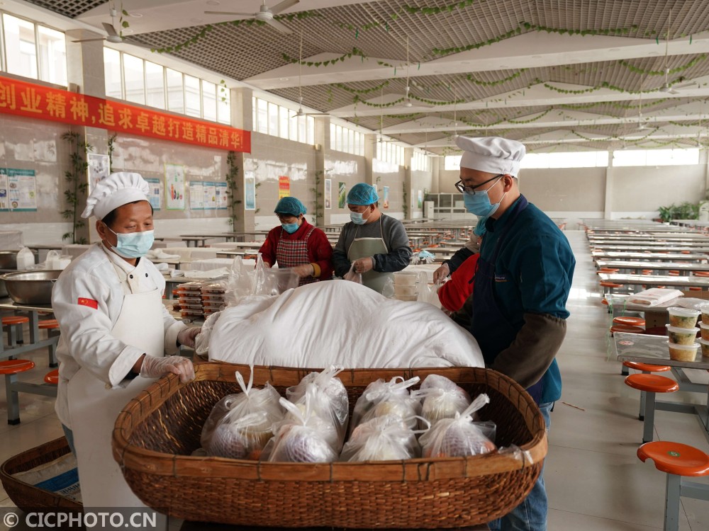 ↑2021年1月15日,在河北省邢台市巨鹿县清华园小学集中隔离点,工作人员在配备营养餐。CICPHOTO/胡良川 摄