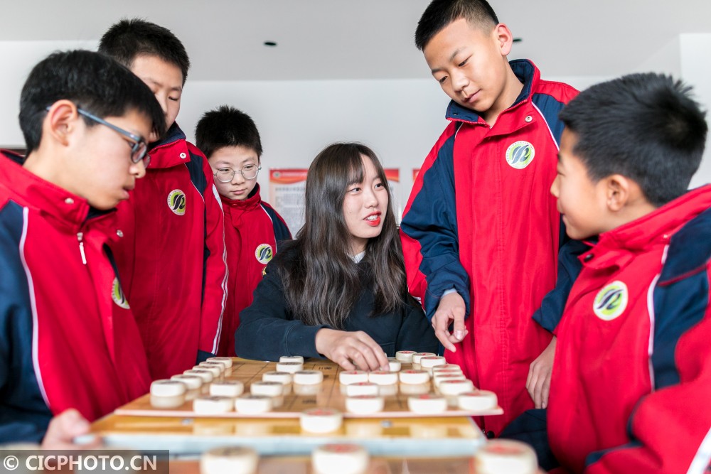 ↑2021年1月14日,大学生志愿者在乡村少年宫指导学生们下象棋。CICPHOTO/丁根厚 摄