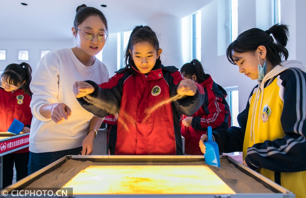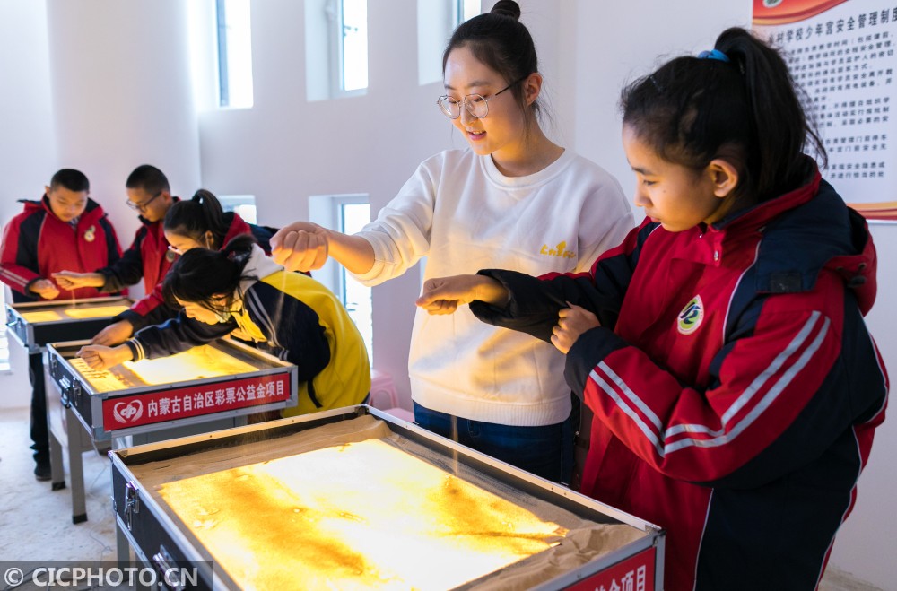 ↑2021年1月14日,大学生志愿者在乡村少年宫指导学生们练习沙画。CICPHOTO/丁根厚 摄
