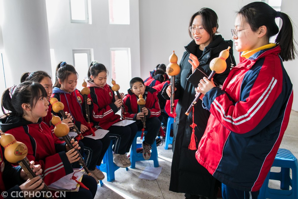↑2021年1月14日,大学生志愿者在乡村少年宫指导学生们吹葫芦丝。CICPHOTO/丁根厚 摄