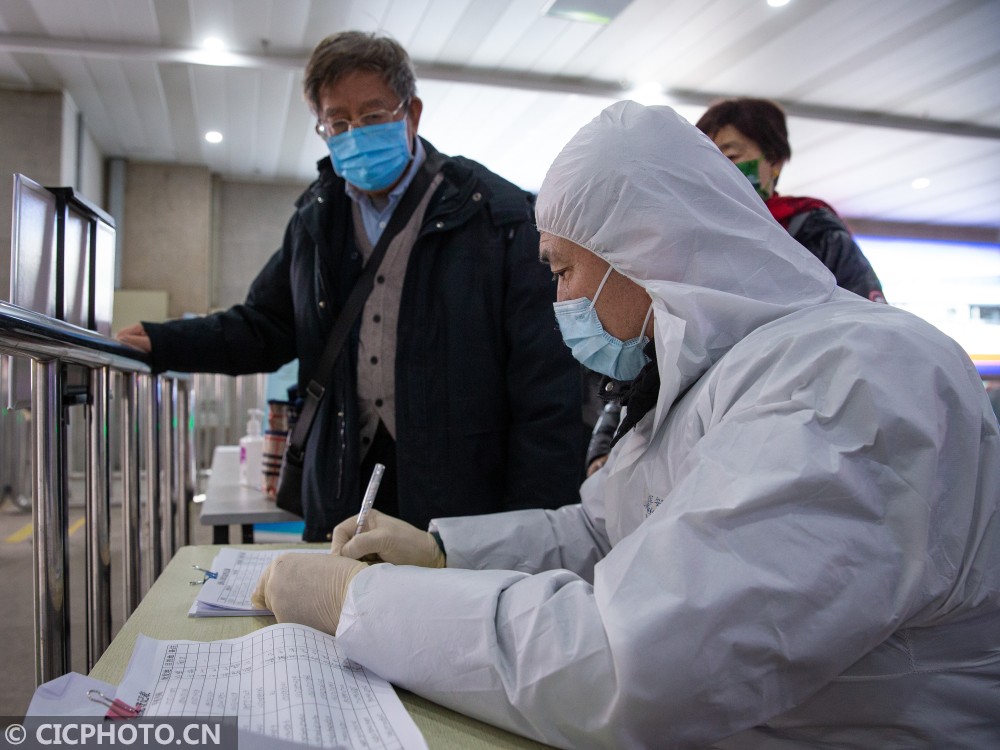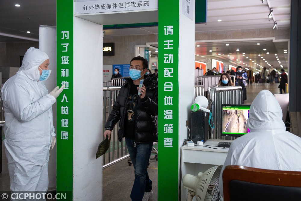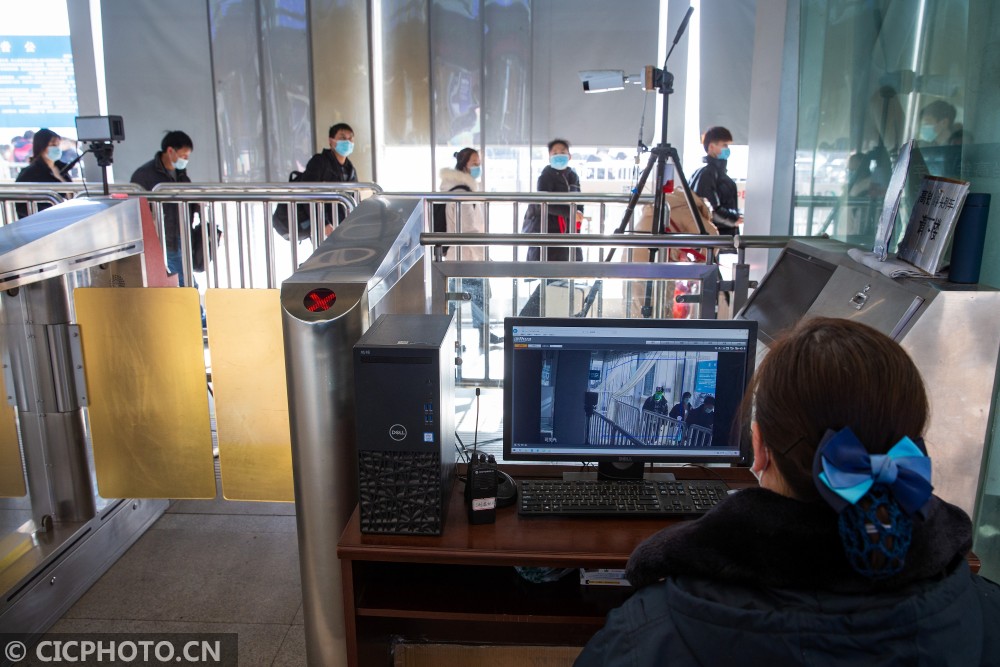 ↑2021年1月14日,在南京火车站进站口,工作人员对旅客进行测温。CICPHOTO/苏阳 摄