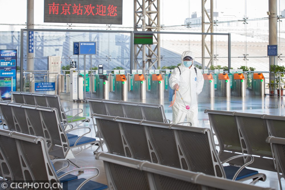 ↑2021年1月14日,工作人员在对南京火车站候车室进行消毒。CICPHOTO/苏阳 摄