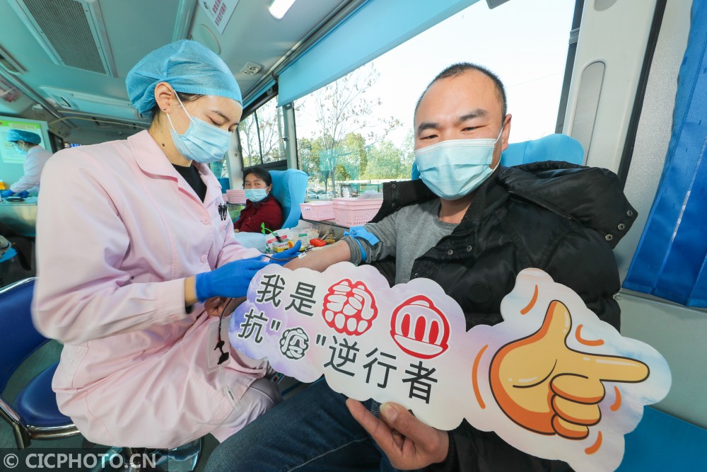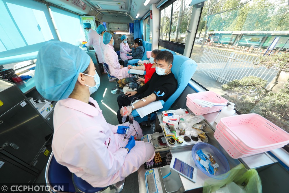 ↑在浙江省湖州市德清县阜溪街道,志愿者在献血车上献血。CICPHOTO/王正 摄