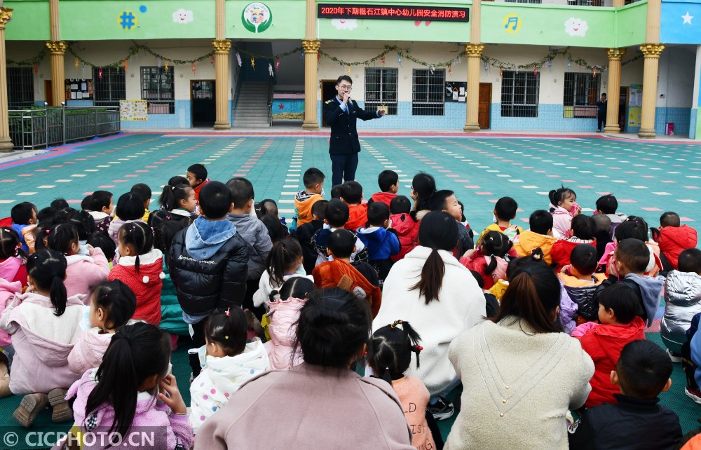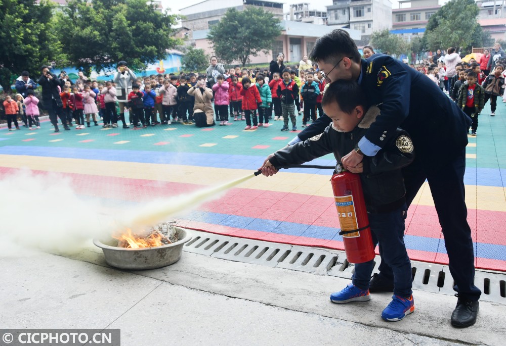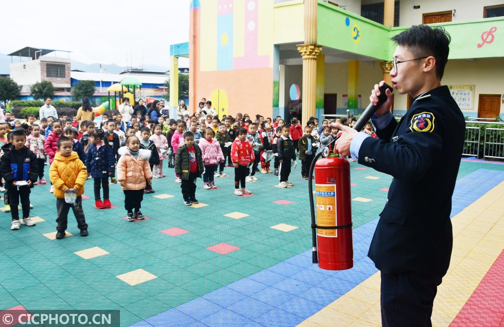 ↑2021年1月14日,在湖南省永州市江永县粗石江镇中心幼儿园,消防员在讲解灭火器的使用方法。CICPHOTO/田如瑞 摄