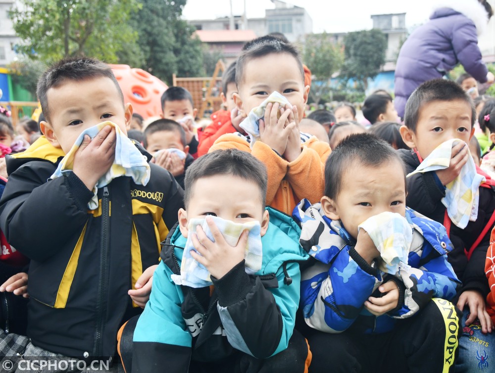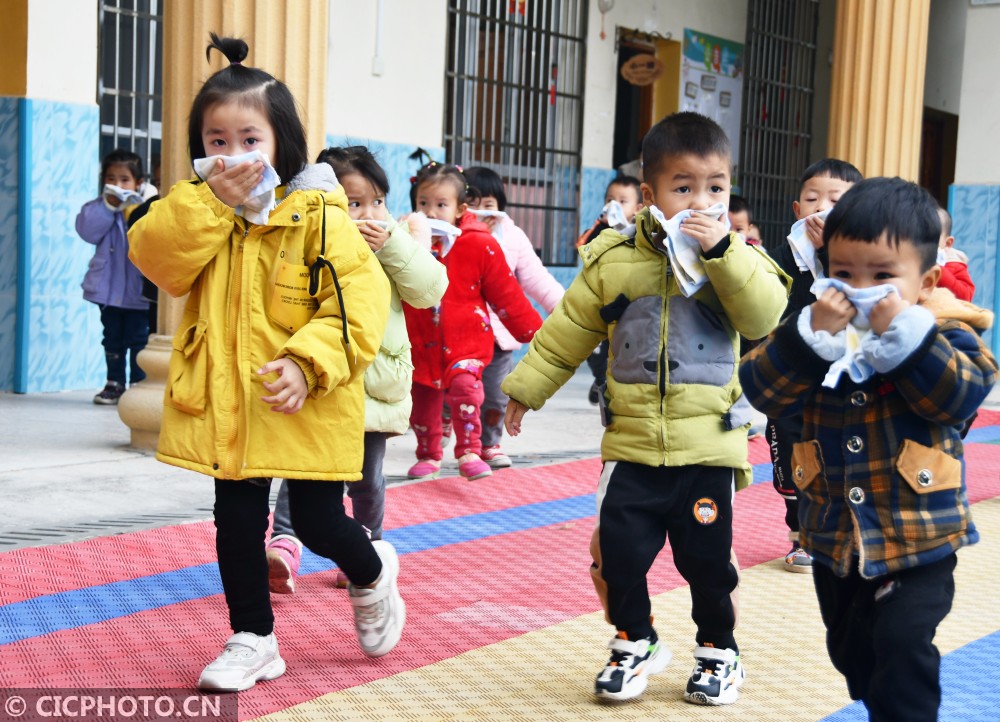 ↑2021年1月14日,在湖南省永州市江永县粗石江镇中心幼儿园,小朋友们在消防员的指导下进行逃生演练。CICPHOTO/田如瑞 摄