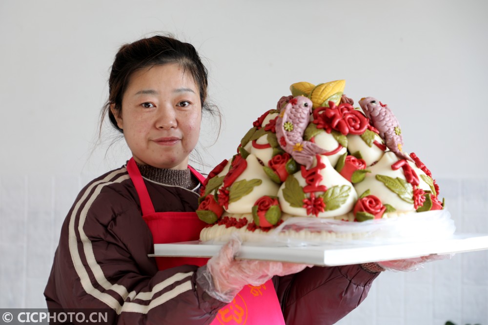 ↑2021年1月13日,在山东省荣成市人和镇,“巾帼创客”在展示制作好的“胶东花饽饽”。CICPHOTO/林海珍 摄