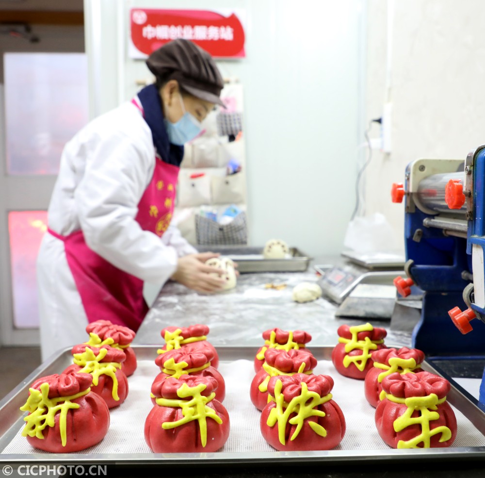 ↑2021年1月13日,在山东省荣成市人和镇,“巾帼创客”在制作“胶东花饽饽”。CICPHOTO/林海珍 摄