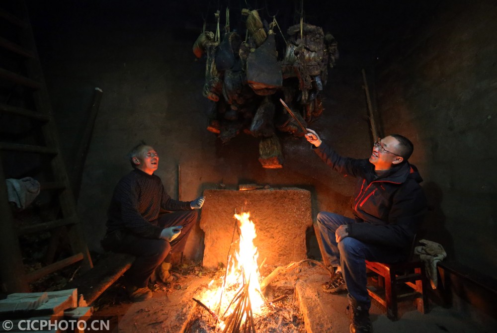 ↑2021年1月13日,在重庆市黔江区沙坝镇木良村,驻村第一书记肖鸣(右)在查看村民侯文杰的烟熏过年腊猪肉。CICPHOTO/杨敏 摄