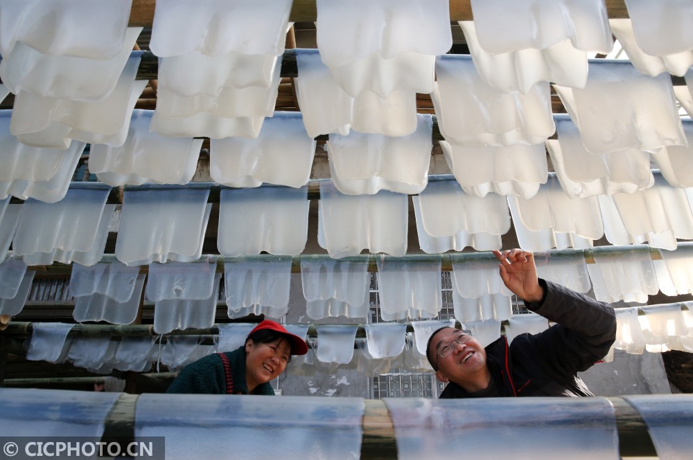 ↑2021年1月13日,在重庆市黔江区沙坝镇木良村,驻村第一书记肖鸣(右)在查看村民龚明银晾晒的手工红薯粉。CICPHOTO/杨敏 摄