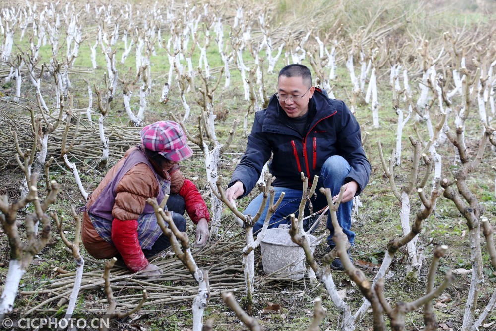 ↑2021年1月13日,在重庆市黔江区沙坝镇木良村,驻村第一书记肖鸣(右)在指导村民张晓联给桑树刷防虫石灰水。CICPHOTO/杨敏 摄