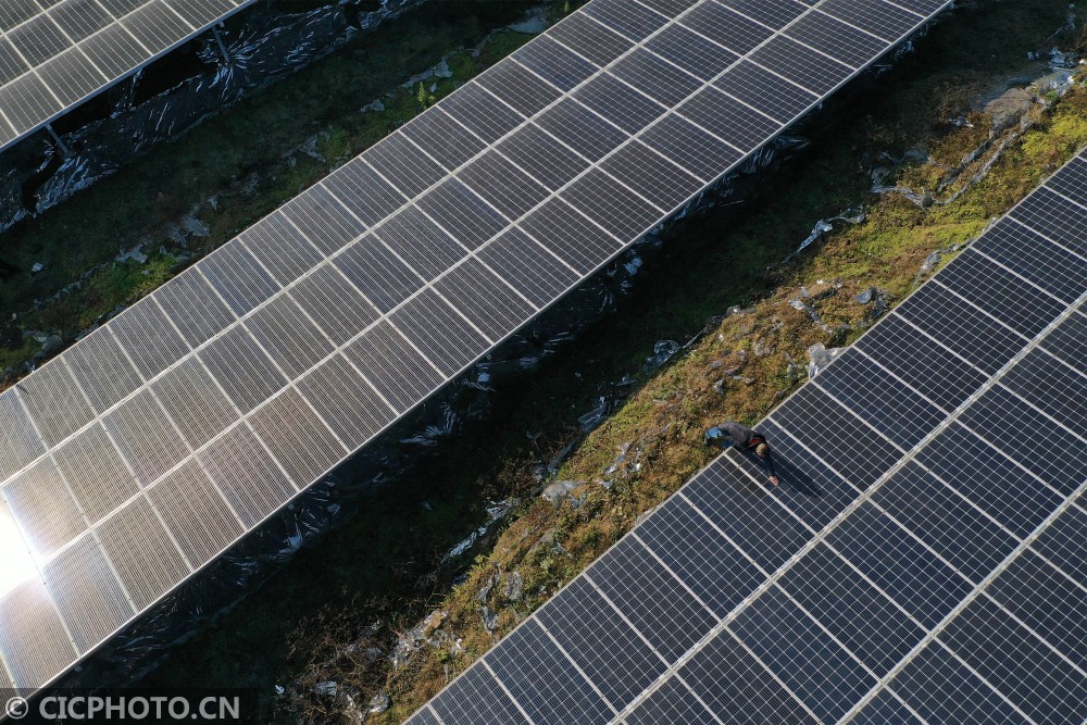 ↑2021年1月13日,在重庆市黔江区沙坝镇木良村,驻村第一书记肖鸣在检查光伏扶贫电站的运行情况(无人机照片)。CICPHOTO/杨敏 摄