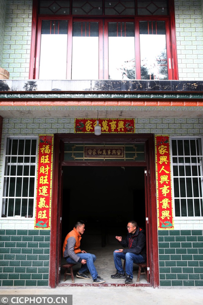 ↑2021年1月13日,在重庆市黔江区沙坝镇木良村,驻村第一书记肖鸣(右)在了解易地扶贫搬迁户庞家海的生活情况。CICPHOTO/杨敏 摄