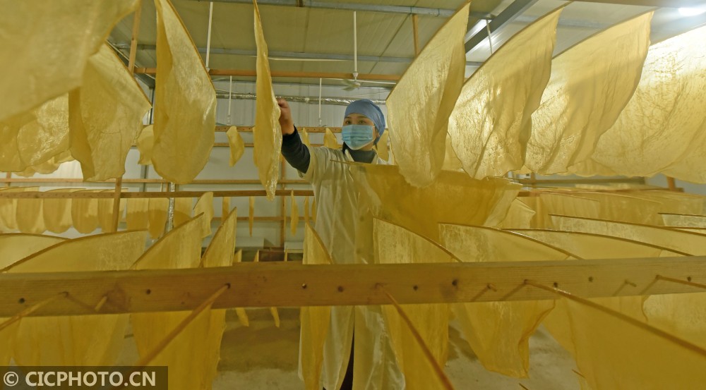 ↑2021年1月14日,浙江省台州市仙居县埠头镇十都英村一豆腐皮加工作坊,员工在烘房干燥豆腐皮。CICPHOTO/王华斌 摄