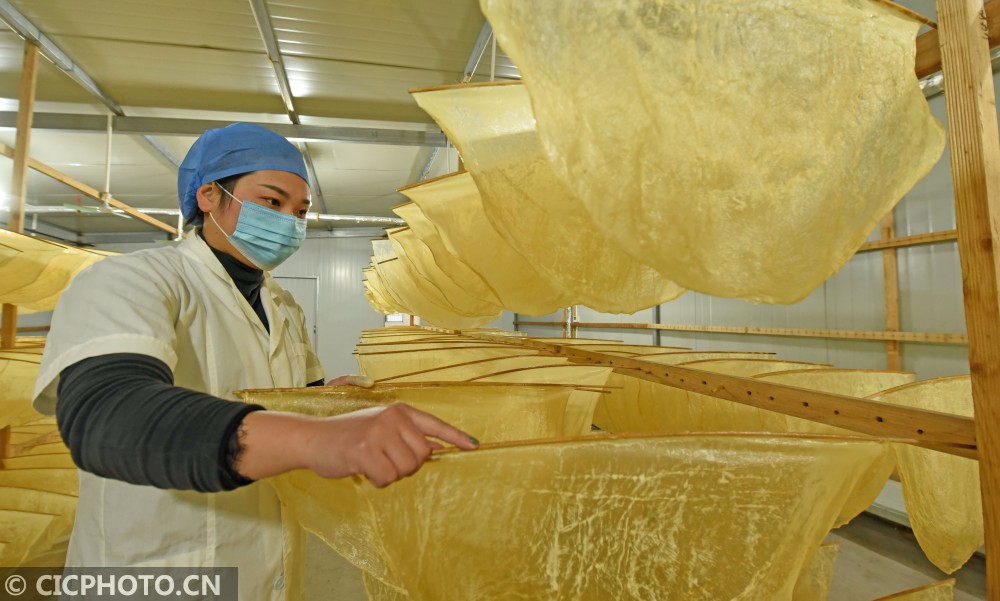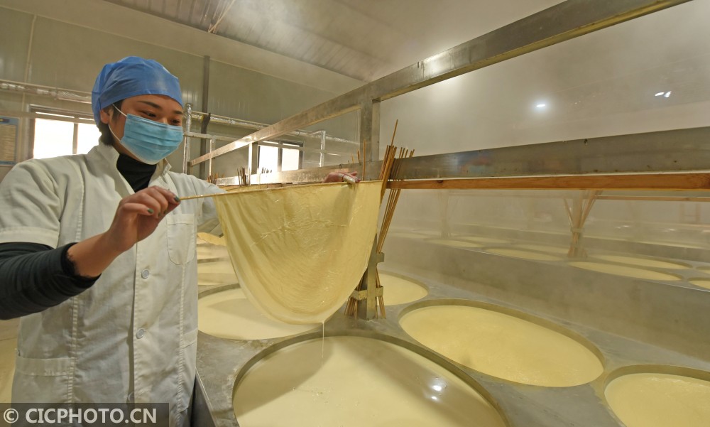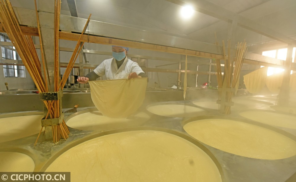 ↑2021年1月14日,浙江省台州市仙居县埠头镇十都英村一豆腐皮加工作坊,员工在制作豆腐皮。CICPHOTO/王华斌 摄