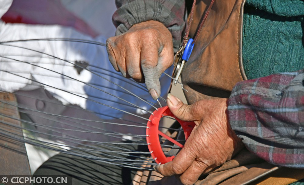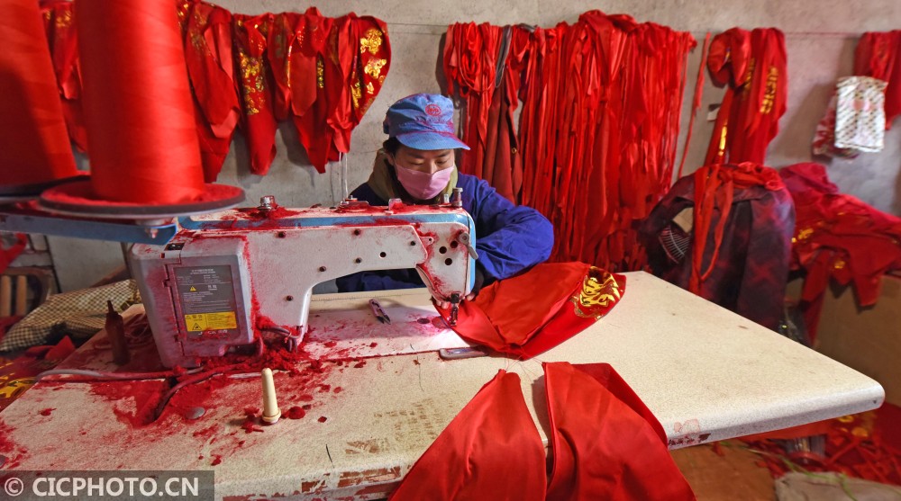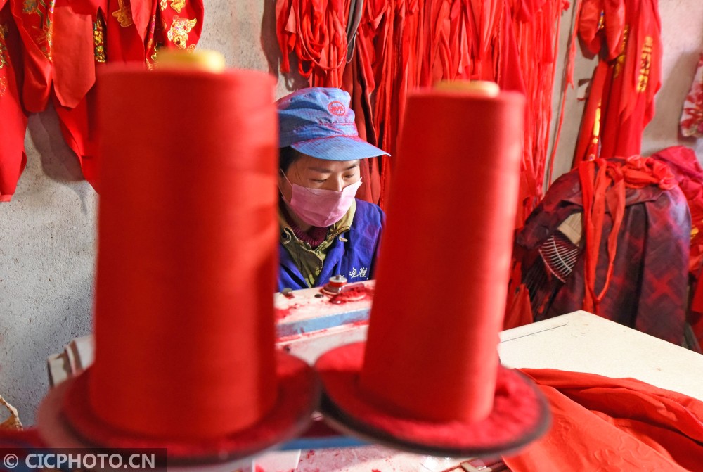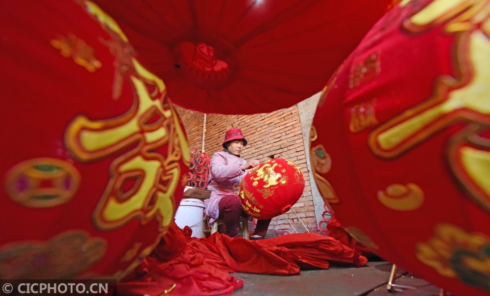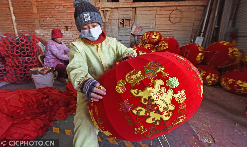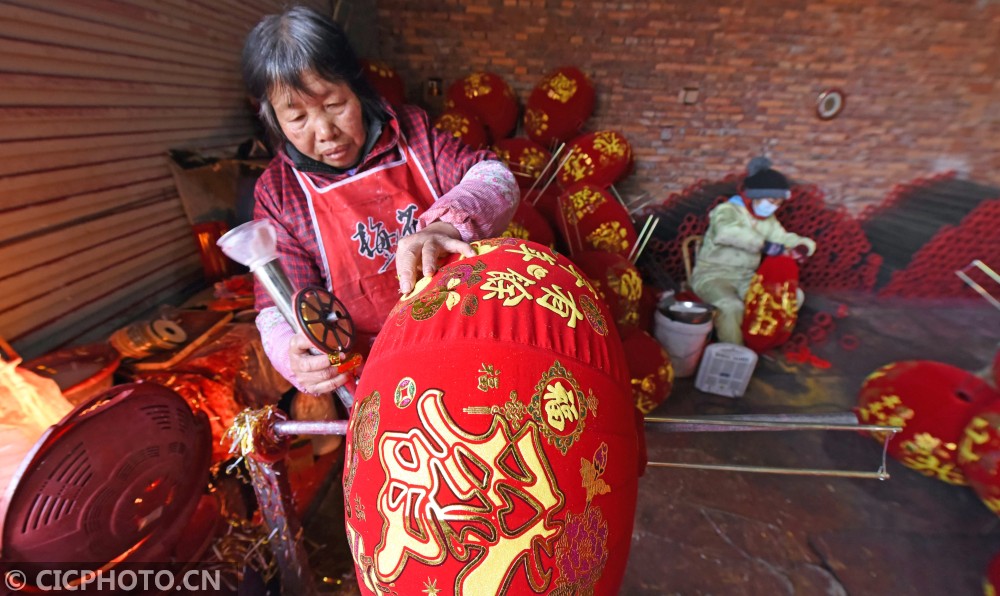 ↑2021年1月14日,浙江省台州市仙居县横溪镇一灯笼加工作坊,农民在为客户赶制大红灯笼。CICPHOTO/王华斌 摄