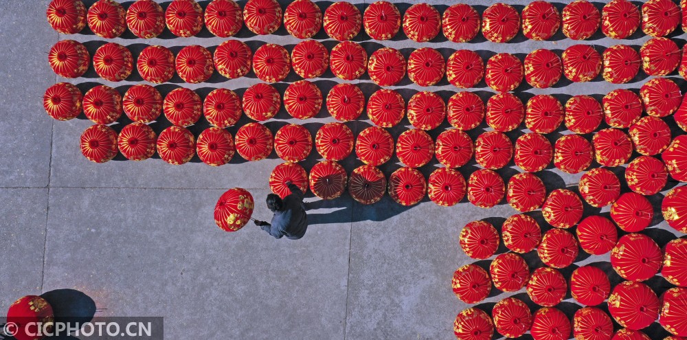↑2021年1月14日,浙江省台州市仙居县横溪镇一灯笼加工作坊,农民在为客户赶制大红灯笼(无人机拍摄)。CICPHOTO/王华斌 摄