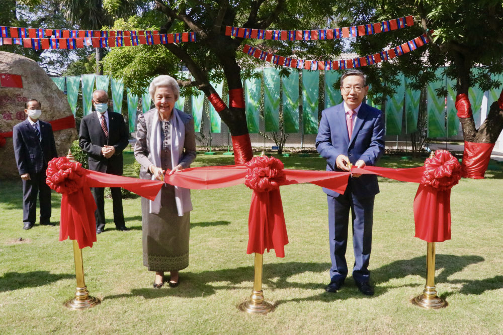 1月14日,柬埔寨太后莫尼列(前左)与中国驻柬埔寨大使王文天(右)在金边为中柬友谊园剪彩。(新华社记者毛鹏飞摄)