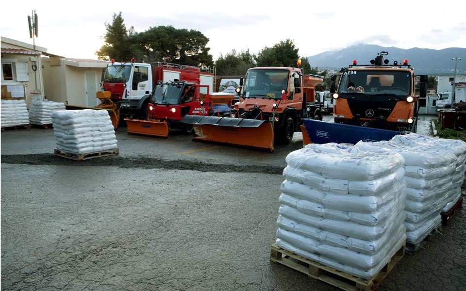 为了迎接气温骤降可能带来的降雪,在雅典北部卡潘德里蒂地区,市政当局已经在开始准备大量的袋装融雪盐,以防突然的降雪所造成的路面结冰情况出现。(总台记者 李冠男)