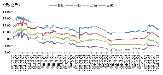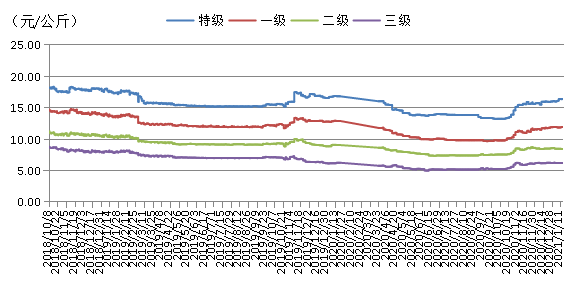 新疆产区方面,截至1月14日,特级骏枣每公斤出货均价较上周同期上涨0.22元,其余等级骏枣每公斤出货均价下跌0.12元至0.34元不等;特级、一级灰枣价格本周出现涨势,每公斤出货均价较上周同期分别上涨0.27元和0.05元,二级灰枣每公斤出货均价下跌0.03元,三级灰枣价格持平。调研显示,新疆产区枣企近日红枣订单量明显增加,出货顺畅,企业根据市场行情积极调整售价,高品质红枣市场供应较少,支撑高等级红枣价格上涨,低等级红枣供应稳定,销售价格无明显变化。未来短期,新疆产区红枣价格或将窄幅上涨。