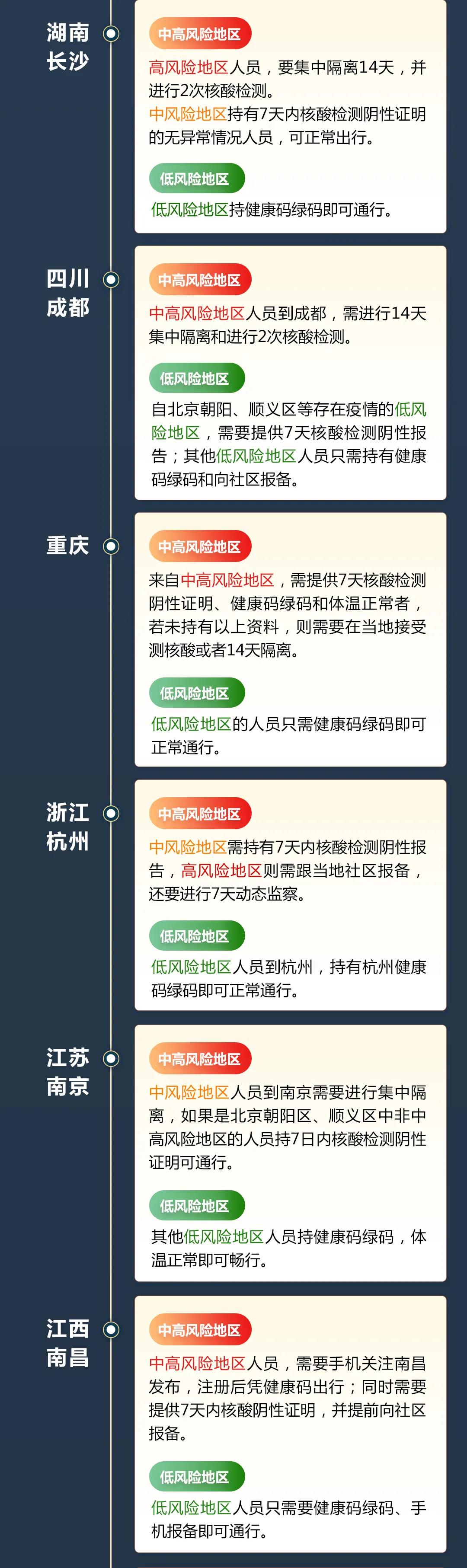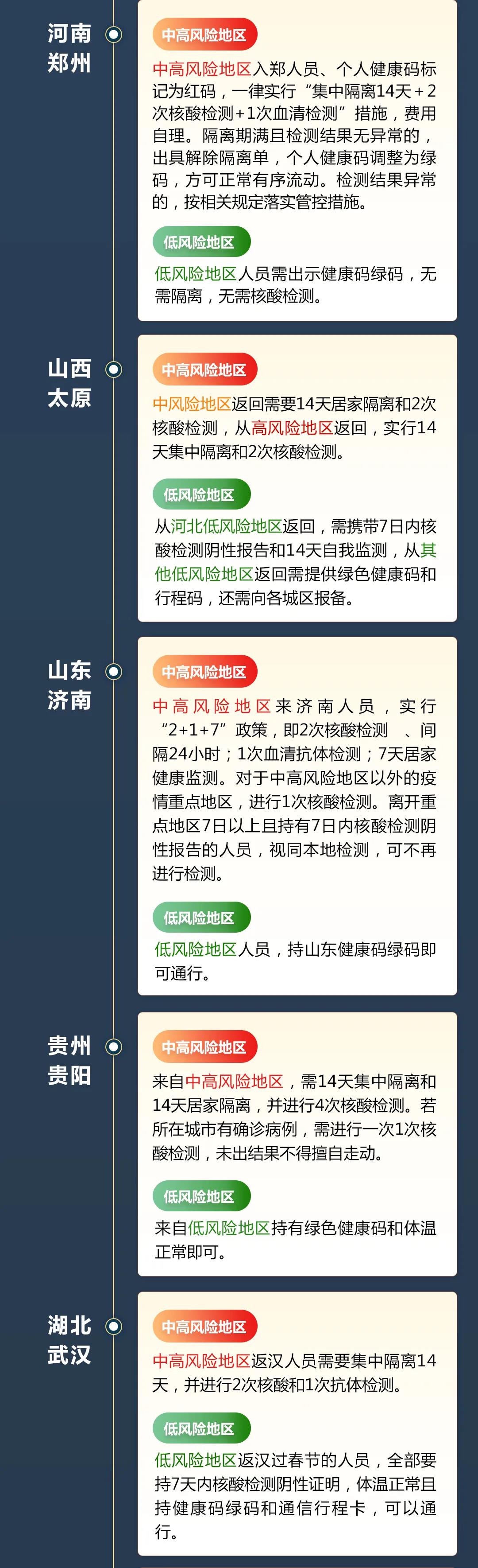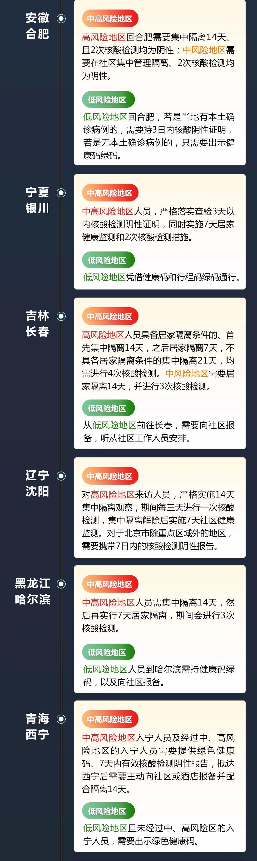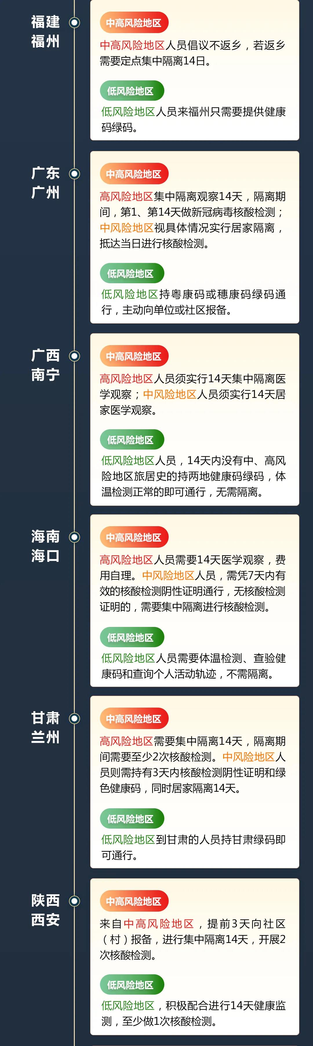 目前,全国31省区市均出台了返乡隔离政策。各地政策有一定区别,但均要求中高风险区返乡人员接受隔离,同时进行核酸检测。