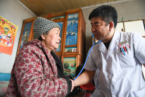 2020年3月20日,在吉林省梨树县万发镇榆树村,梨树县第一人民医院医生韩晓君(右)为村民王丽玲检查身体。